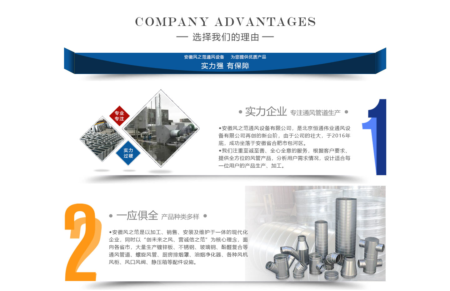 安徽風(fēng)之范通風(fēng)設(shè)備有限公司,是北京恒通偉業(yè)通風(fēng)設(shè)備有限公司再創(chuàng)的新臺階,多年來,公司員工憑著“誠信敬業(yè)、團(tuán)結(jié)拼搏、勇于開拓、務(wù)實(shí)進(jìn)取”的企業(yè)精神,先后承接了多項(xiàng)重點(diǎn)工程項(xiàng)目,使公司健康穩(wěn)步發(fā)展。現(xiàn)由于公司的壯大,業(yè)務(wù)的拓展,又于2016年底,成功坐落于安徽省合肥市包河區(qū)。本公司生產(chǎn)設(shè)備精良,技術(shù)力量雄厚,質(zhì)保體系完善!讓用戶體驗(yàn)到,貼心的服務(wù),無憂的售后!風(fēng)之范是以加工、銷售、安裝及維護(hù)于一體的現(xiàn)代化企業(yè),同時以“創(chuàng)未來之風(fēng)、營誠信之范”為核心理念,面向全國各省市,大量生產(chǎn)鍍鋅板、不銹鋼、玻璃鋼、酚醛復(fù)合等通風(fēng)管道、螺旋風(fēng)管、廚房排煙罩、油煙凈化器、各種風(fēng)機(jī)風(fēng)柜、風(fēng)口風(fēng)閥、靜壓箱等配件設(shè)施。廣泛承接商場、工廠、酒店、寫字樓、地下室等,消防排煙工程、除塵凈化工程、室內(nèi)通風(fēng)工程、暖通空調(diào)工程、廚房排煙凈化工程。我們力求上進(jìn),追求,歡迎各界人士技術(shù)指導(dǎo),經(jīng)濟(jì)合作,共創(chuàng)美好明天!